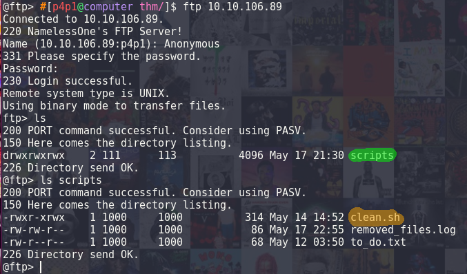 In the image we can see my login is Anonymous with no password. After logging in I started digging around, I found a folder named scripts/ highlighted in green. That is obviously interesting to us. Inside of scripts their is also a really nice file called clean.sh, highlighted in orange. I decided to copy that file to my machine so that I could look at it.