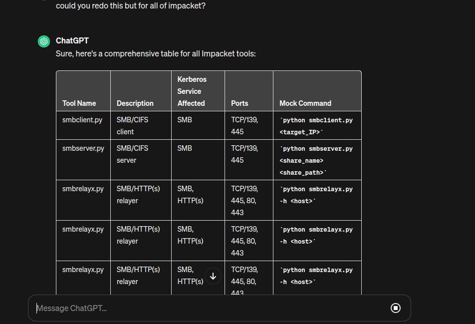 Honestly I couldn't see the use of chat GPT in my work the code sample are quite wrong most of the time and it can't really tell me how to exploit certain things. But for report writing and having starting checklists I think chat GPT is amazing. I use it to quickly explain me certain exploits like CSRF definitions etc.. I actually use the impacket example in my notion: