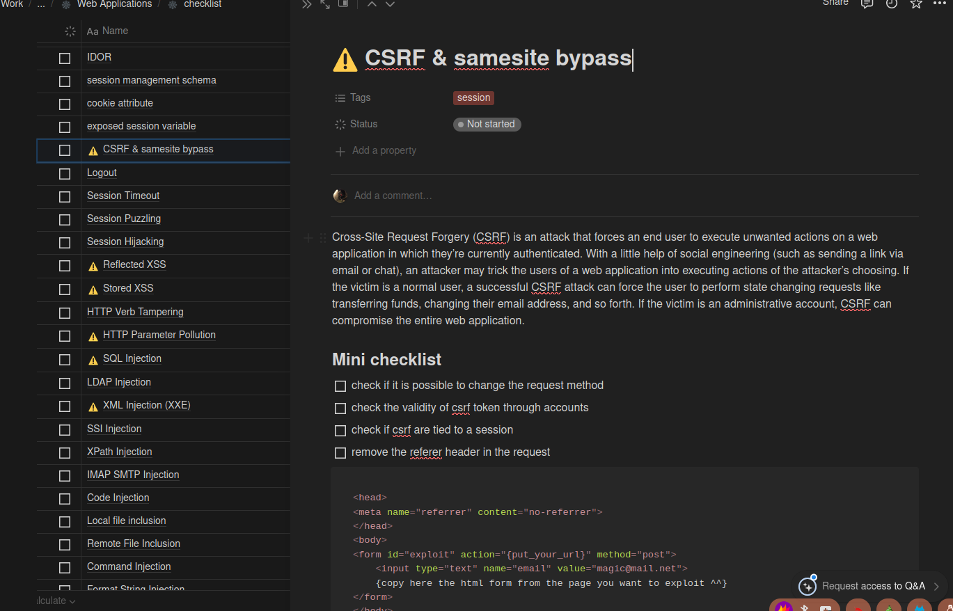 Then it's the actual checklists the meat and potatoes of my organisation where you can find all of the vulnerabilities and how I would detect them and exploit them. This section really just organises my workflow.