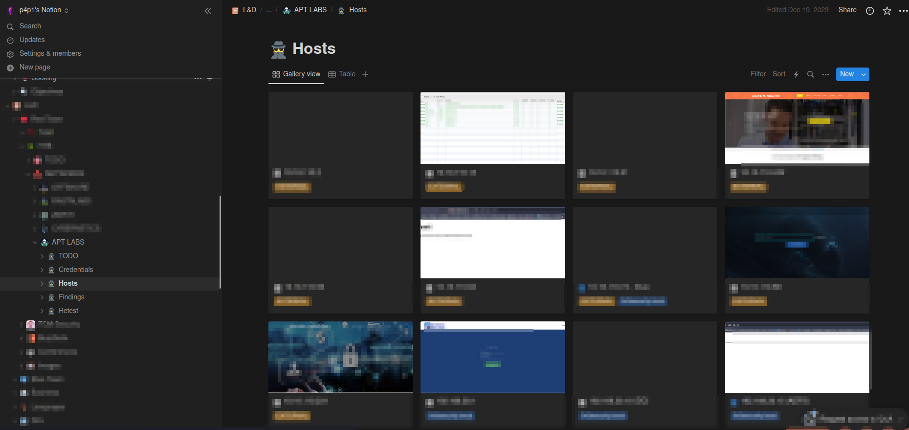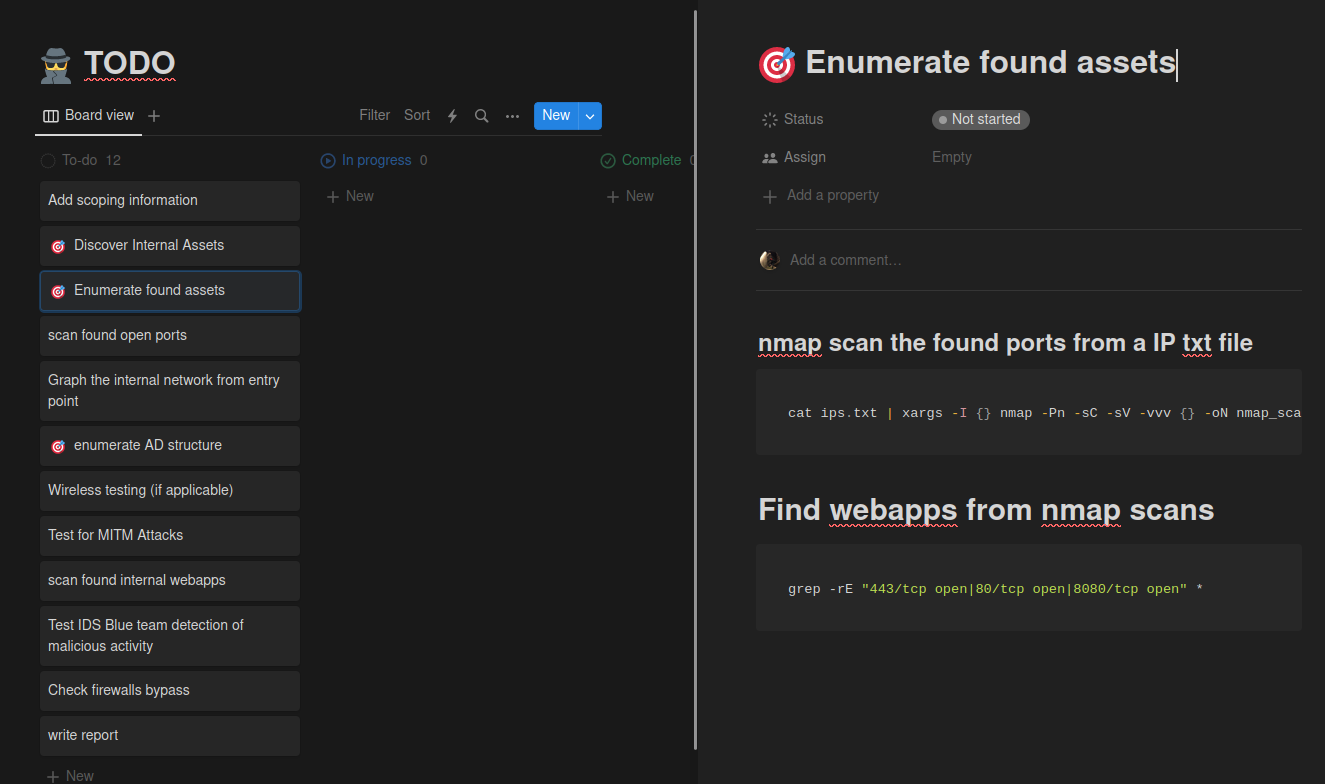 I used this approach on APT since this is why this section is blurred but it shows you a quick overview of one during an engagement instead of just a empty one. Then usually I need to sort through my findings for during an engagement like what did I find what did I exploit etc..