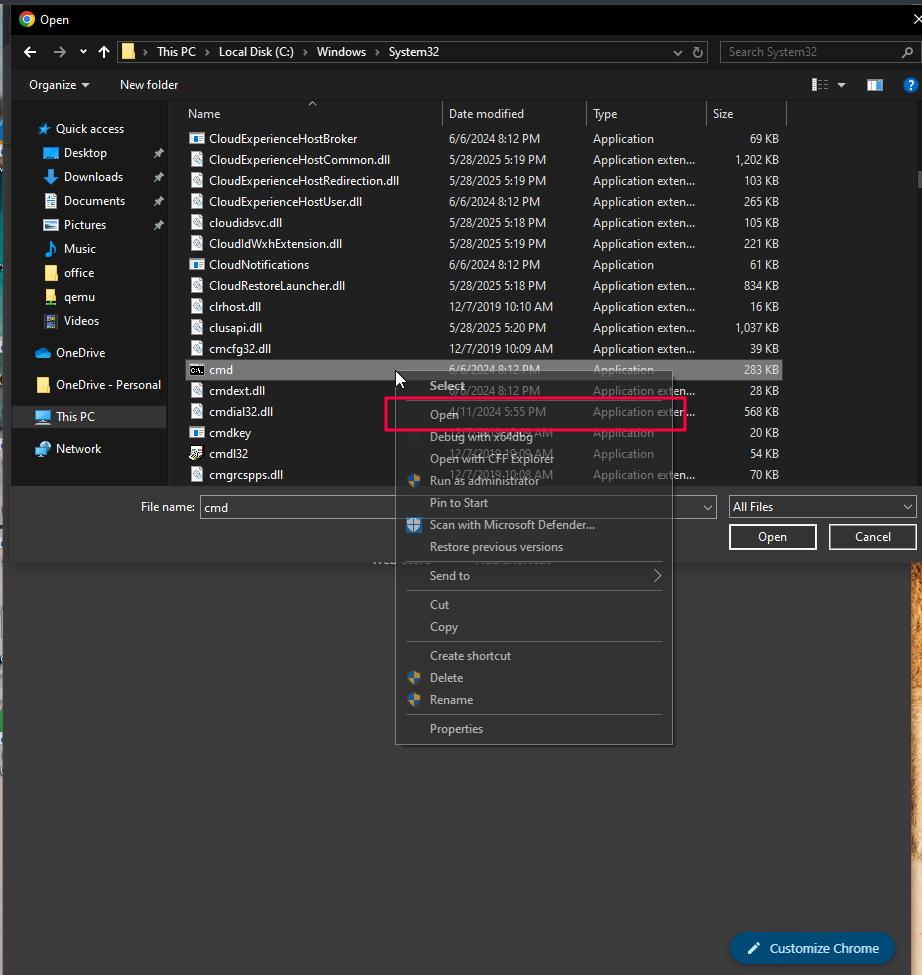 Now from what was previously explained you can make a small mental picture of what is going on. This website is running applications on a target network and on your machine you can interact with them. Something basic we can try is just application breakouts like for example getting to run cmd.exe from chrome! Note I am running all of this locally for the showcase but during a pentest you would have access to the target net. So on the citrix website we would click the application chrome wait for it to open. The we could do <Ctrl-O> shortcut to open a file then navigate to C:\windows\system32\ and execute cmd.exe
