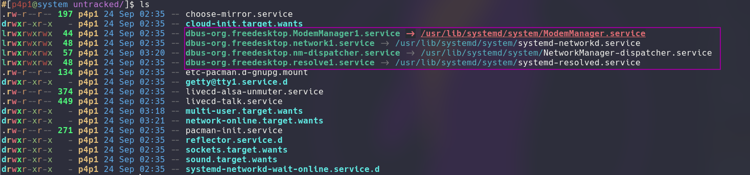 Then with this information you need to navigate inside of the working directory to airootfs/etc/systemd/system this is where you will find a lot of the information about the enabled services. Inside of the ln command you will have to put the second value on the right of the systemctl output and name the file exactly like on the left of the systemctl output.
