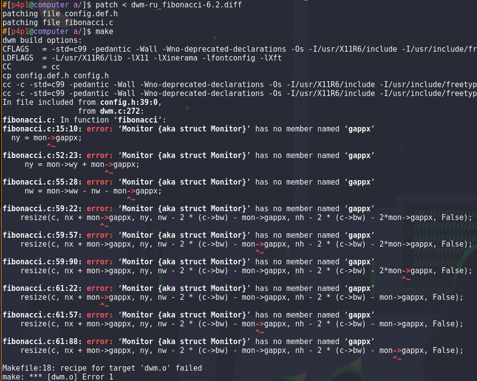 To begin with I got a clean version of dwm6.2 and patched it with the ru-fibonacci patch... And the compilation failed: