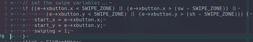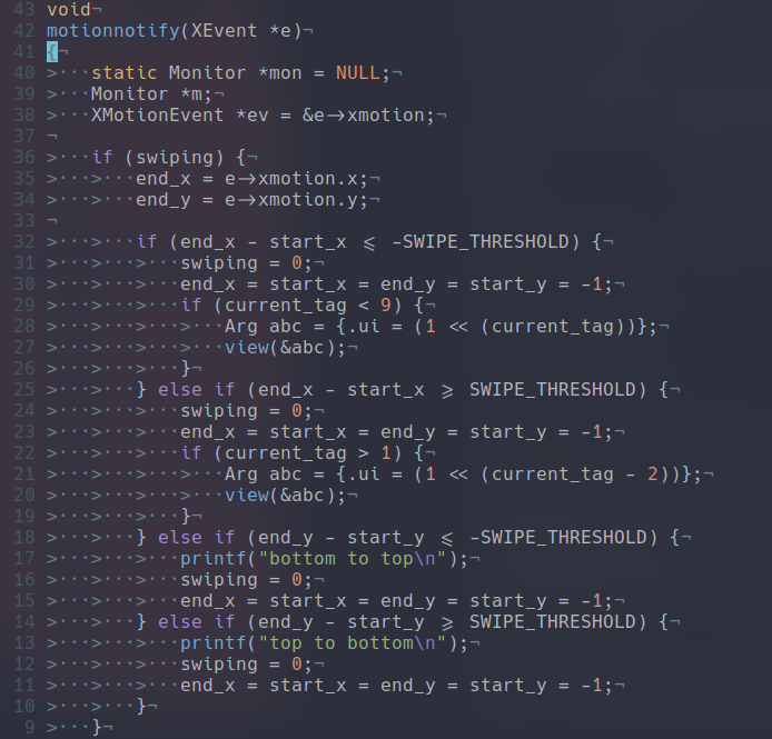 Now inside of dwm there is a cool function called motion notify that gets called during movement of the mouse so we can wrap out logic inside of an if that checks if we are in swiping mode then from there check the orientation of the swipe and then call the appropriate function.