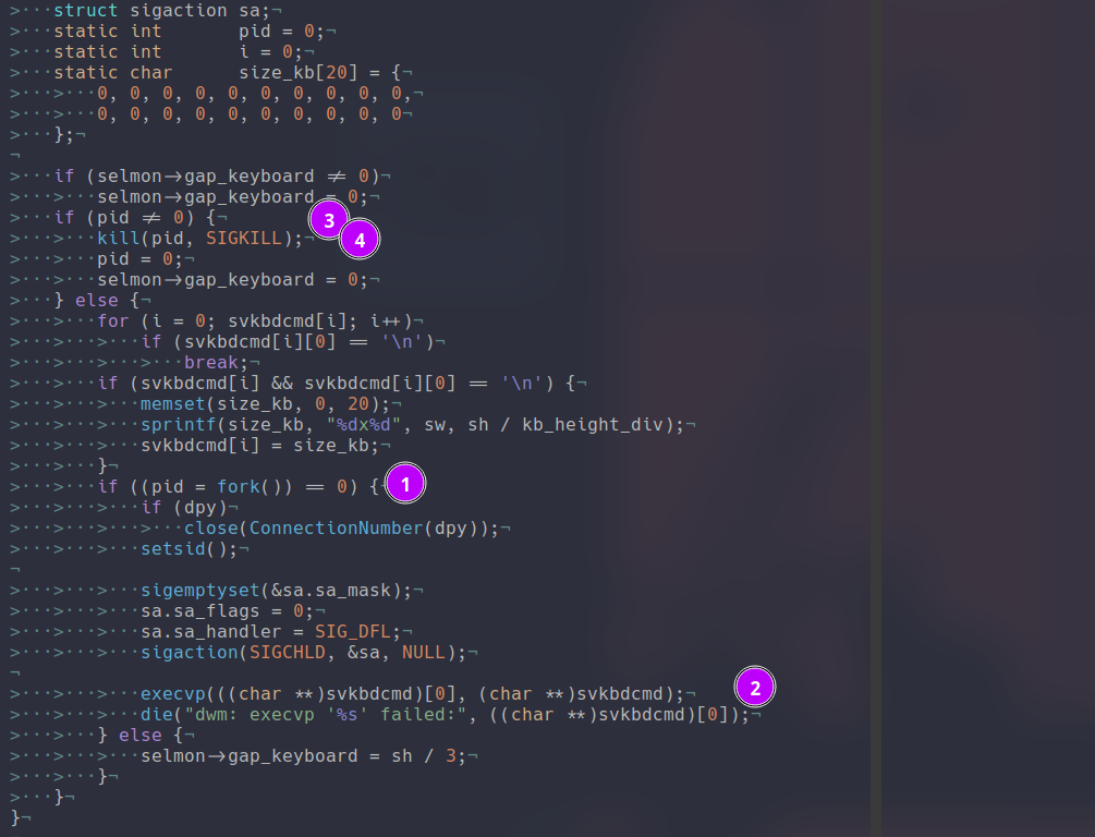 Now to get this I first determined how do I open and close the keyboard seamlessly basically some quick fork and kill logic worked great. On a fork I save the pid(1) of what handles the execve of the keyboard(2) and if that pid is set(3) on running the function again I kill(4) the pid and revert all of the variables.