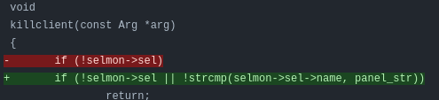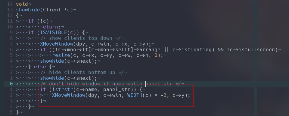 Basically this function is recursive so for every window it will either show or hide it from the currently selected tag (basically tags are desktops). So in red is the code I added where if the class name of the window is panel_str it will just never hide it!