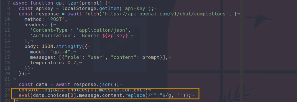 So why is this so vulnerable? Basically the result of chat gpt is ran inside of an eval so if we tell it code to inject it will inject it: