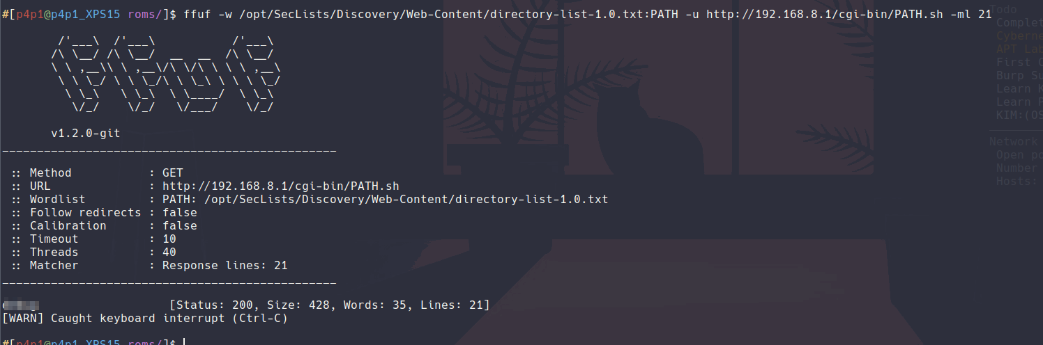 You will get your first flag here congrats but the rest is a bit more tricky most of the common enumeration techniques like gobuster will not work since the router will always return 200 'OK' for any path and finding hidden paths will require a more involved system. During a normal request there is 9 lines per request if we just start by checking everything that is above 9 and slowly increment we will get at some point a request with more that 9 lines or a bigger size you can use BurpSuite which would be great but here is the ffuf command: