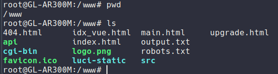 To get this idea working I first started looking at the default web server of the router. I don't really want people messing with the actual website but what if I could configure a hidden page inside of the structure. Inside of openwrt that page is located in /www from there you can see the default structure of the webserver: