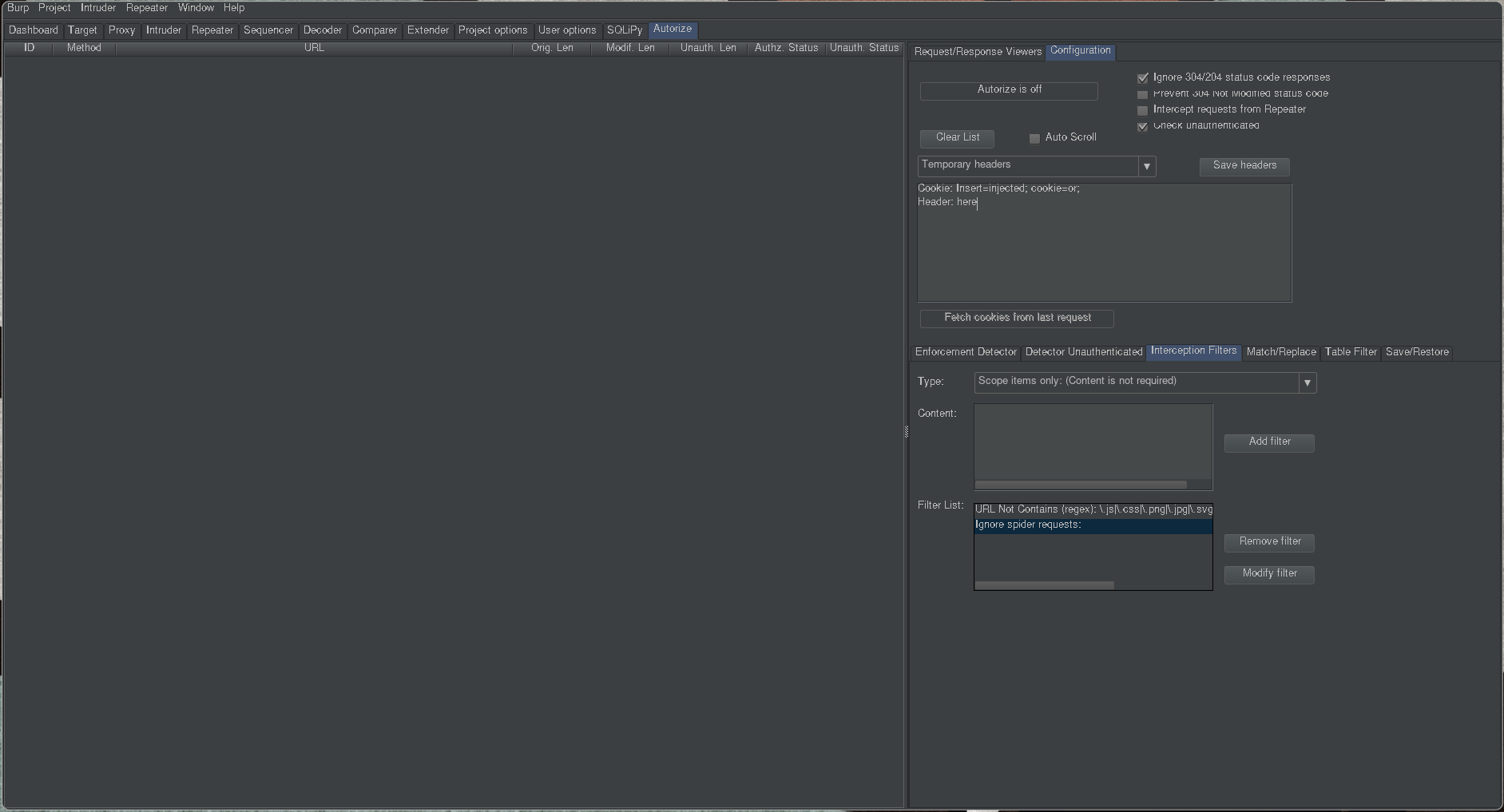 The first thing to keep in mind when using this plugin is that you need to activate it and configure it so that it actually repeats each request with different id's. So when you are using it just check the button that Authorize is in fact on. The second thing you need to configure is to put a header with different cookies than the one you are logged in as, maybe a lower privilege user if you have access to that will always be my go to for the headers section. I then usually add the scope only filter by clicking the Add filter button, the scope only filter is selected by default.