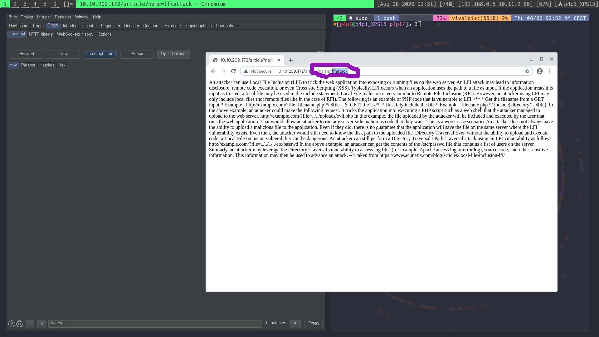 I first started by launching Burp just in case it can come in handy. I then loaded the website and started looking around for a LFI, I then found something interesting on this link: