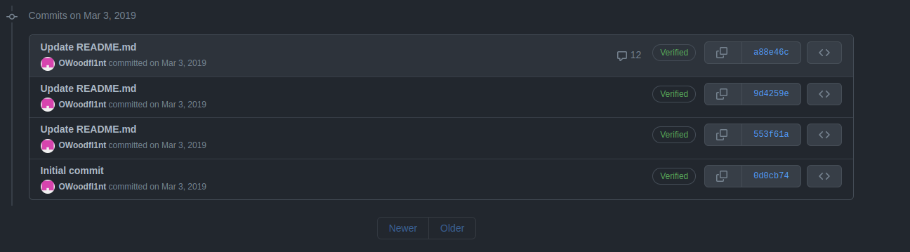 We can see that there has been 4 edits to this repository specifically so we now need to go through them one by one. All of this little tutorial is a quick introduction to what OSINT looks like there is a lot more to cover but to keep this post straight to the point I'll stop here.