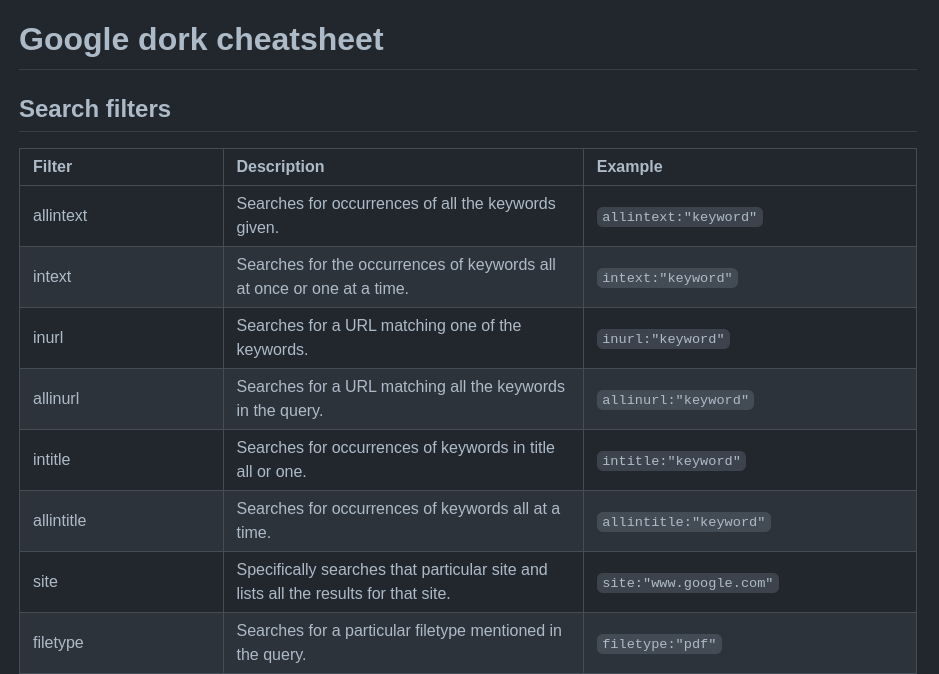 The name for this is quite deceptive even if it has google inside of the name. Google Dorking is not specific to the google search engine. Most search engines have advanced commands to be used to that you can extract as much information as possible from the searches. A few examples for google specifically are the following: