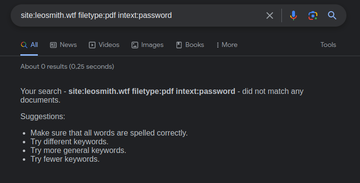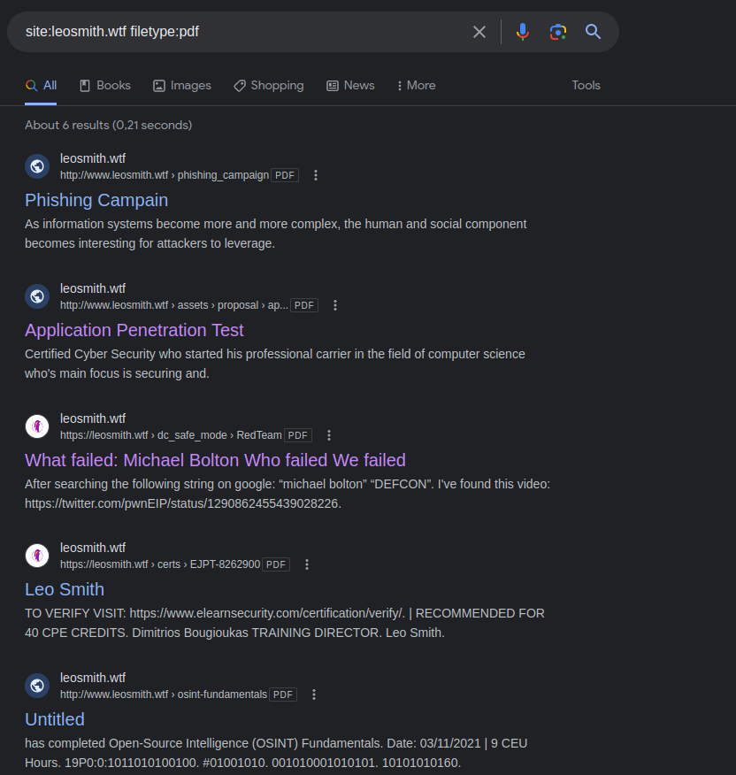 I recommend to try that specific dork for you to get a feel for it. The leosmith.wtf section can be changed to any website wanted. For that one specifically you can see that it returns all of the pdfs that are linked on my website.