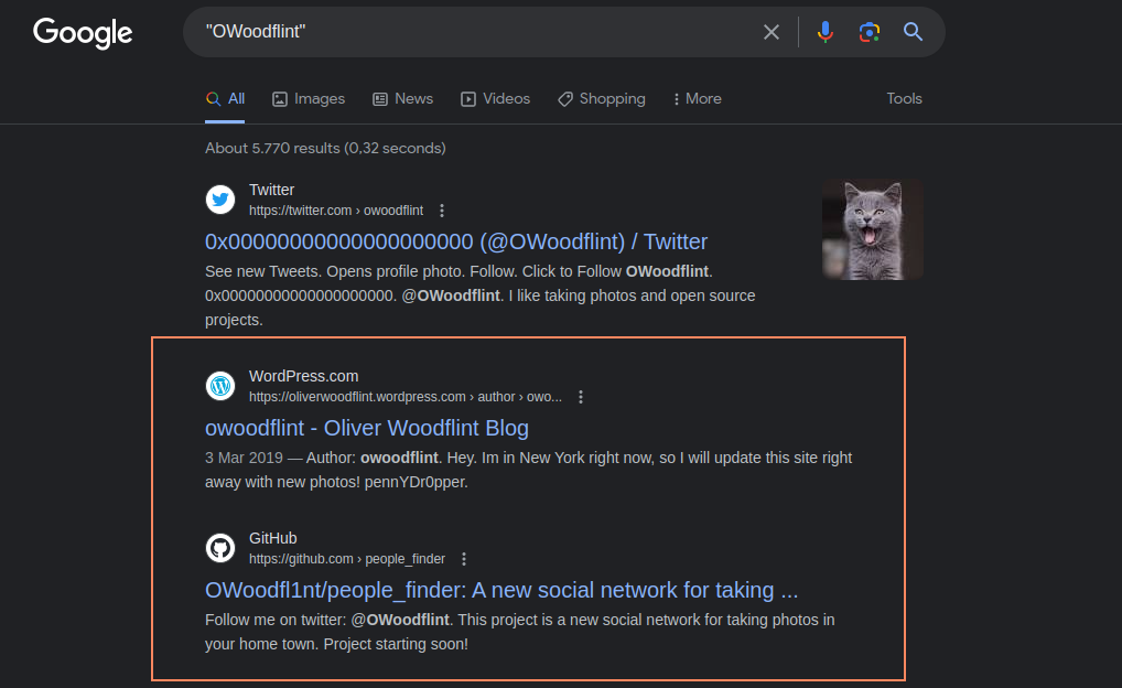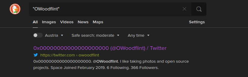 In this case we find a twitter account without needing to do more research. You can also see in the previous picture I used quotes around the word I am searching for that is a shorthand for using the intext search operator.