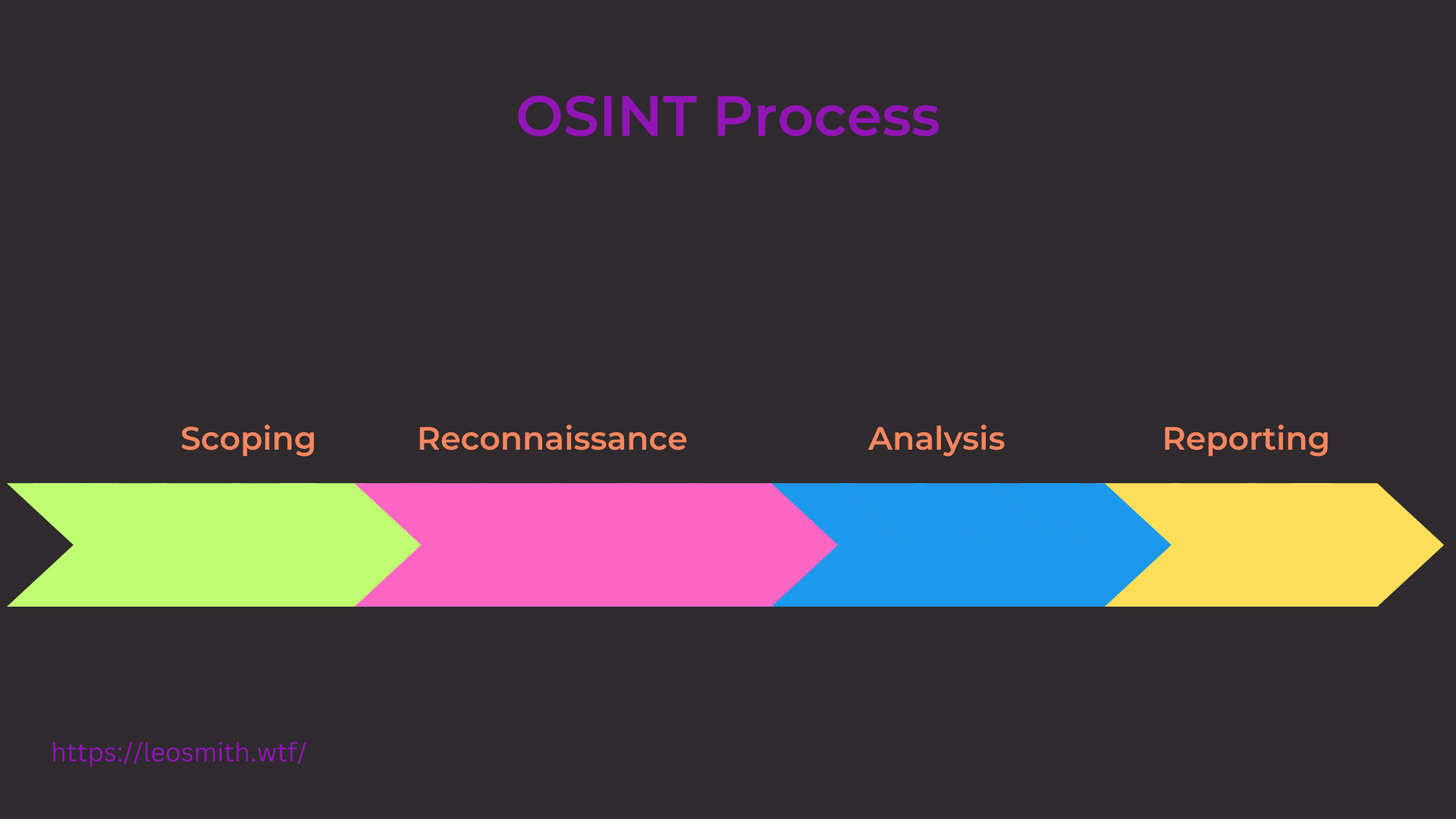 Now like every thing cyber security related the process of getting to your desired goal is overall the same. We first need to determine something us nerds called the scope. Usually in OSINT that is what information do we have to start with and how far we can go. The main crutch with OSINT and when you can do it well it can get scary and intrusive fast. Let's give a small example: We target a person that we want to find information on and slowly but surely we gather more and more information about them then we discover there passwords on a leaked database and then we have full access to their email address. That would not be good if we don't have their specific consent. So just a quick note always be a bit careful on what you are looking for.