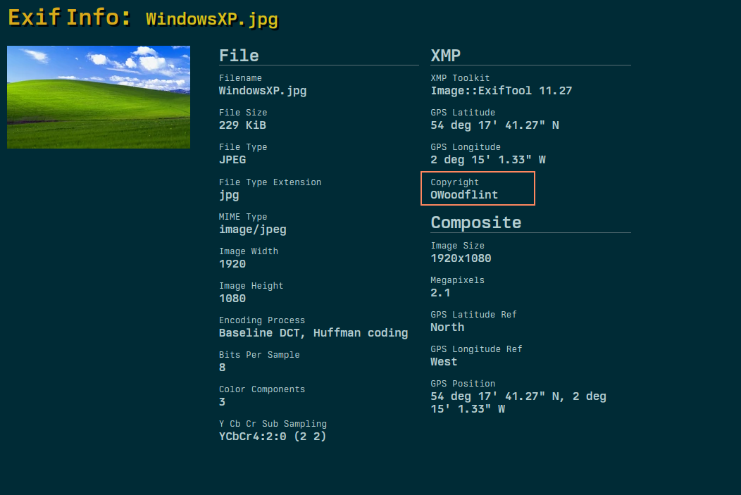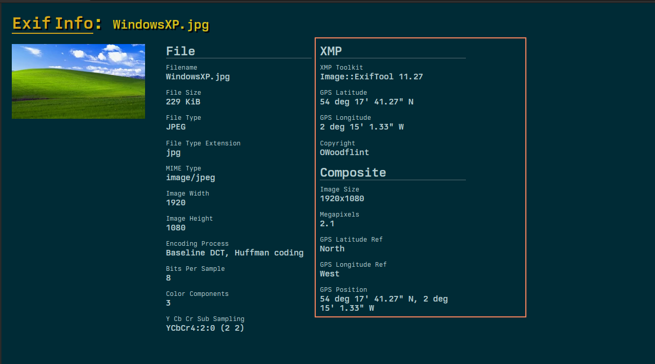 To start we are given a image file. Like explained above we will use the exiftool to see what information we can get: