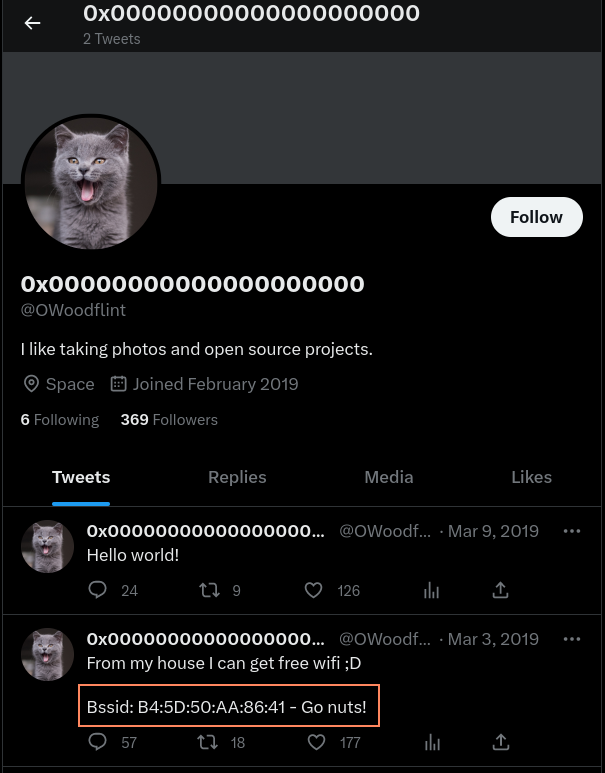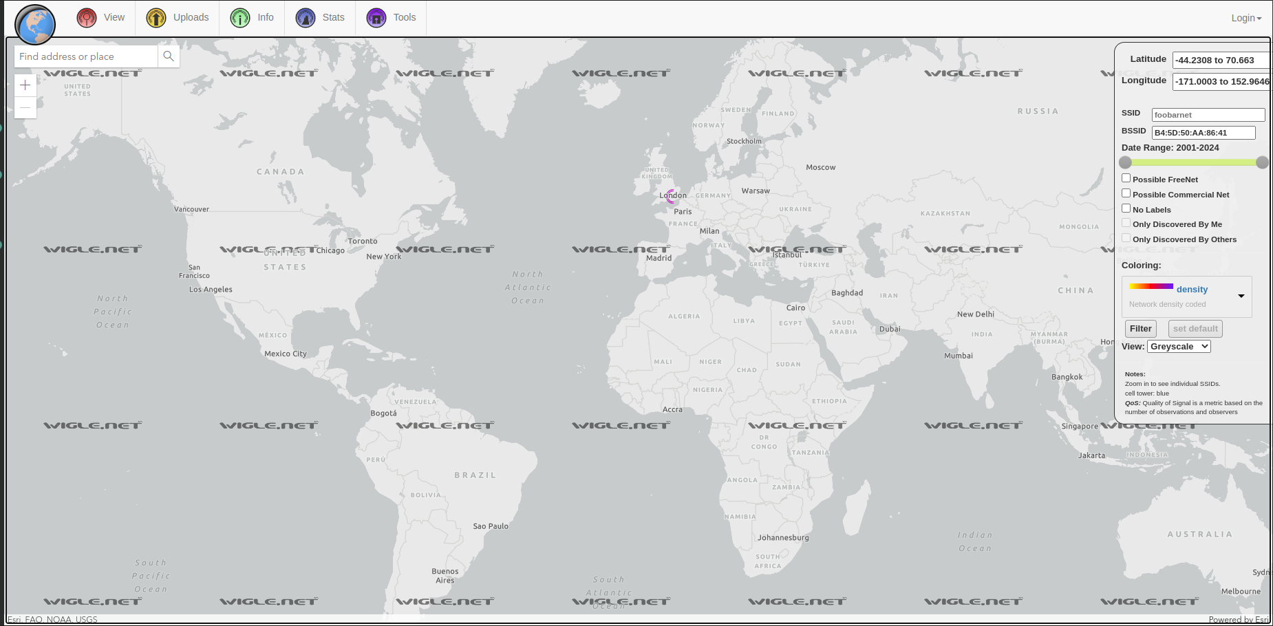 Inside of the twitter posts we have some other information we are not familiar with something called a BSSID. After some google we realise that the BSSID is a address that is assigned to a wifi. (more here) Now I will give a little hint from my technical background and experience but a BSSID is always matched with something called a SSID and that is the name of the wireless network for example 00:00:00:00:00 is the BSSID of Starbuck's Wifi the name is always matched with a number. There is a thing named WarDriving which is a group where people go around collecting wifi names and Id's and uploading them online on a map. The biggest one is operated by Wigle. So we can use their map to find where is located certain networks: