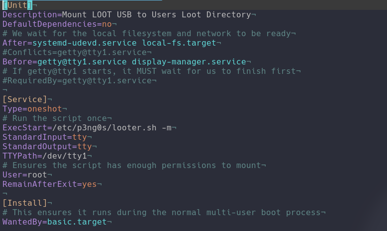 The main issue this this service was the following: Have it be the first thing to run in the system basically everything that is user dependent like the login and whatnot should first wait for this service to finish. This concept was achieved via: Before=. This is what tells systemd to wait this service to finish before running the other specified services. With this folder set in stone and mounted before everything else we actually can control a lot more of what p3ng0s does and the possibilities are endless...