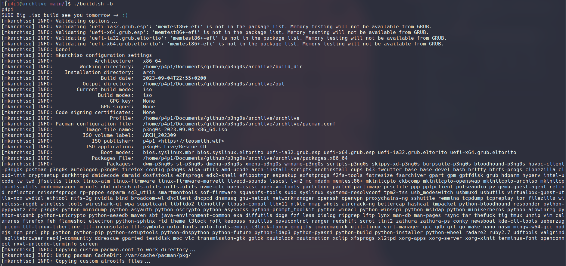If you wish to compile the ISO manually that is also possible using the build.sh script inside of the archlive repository in the p3ng0s official github. With the build.sh script you can modify it and add your own custom .bashrc .vimrc etc.. Directly to the created user inside of the live environment.