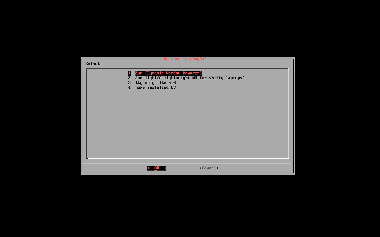 After navigating to the p3ng0s wiki and downloading the ISO you can just burn the ISO to a usb disk and boot from the disk. p3ng0s is a bit different since on initial boot you will be prompted with the OS killer menu which allows you to select a few options. If you just wish to install just select the 1st option dwm. From there calamares will be running on startup of the GUI environment.