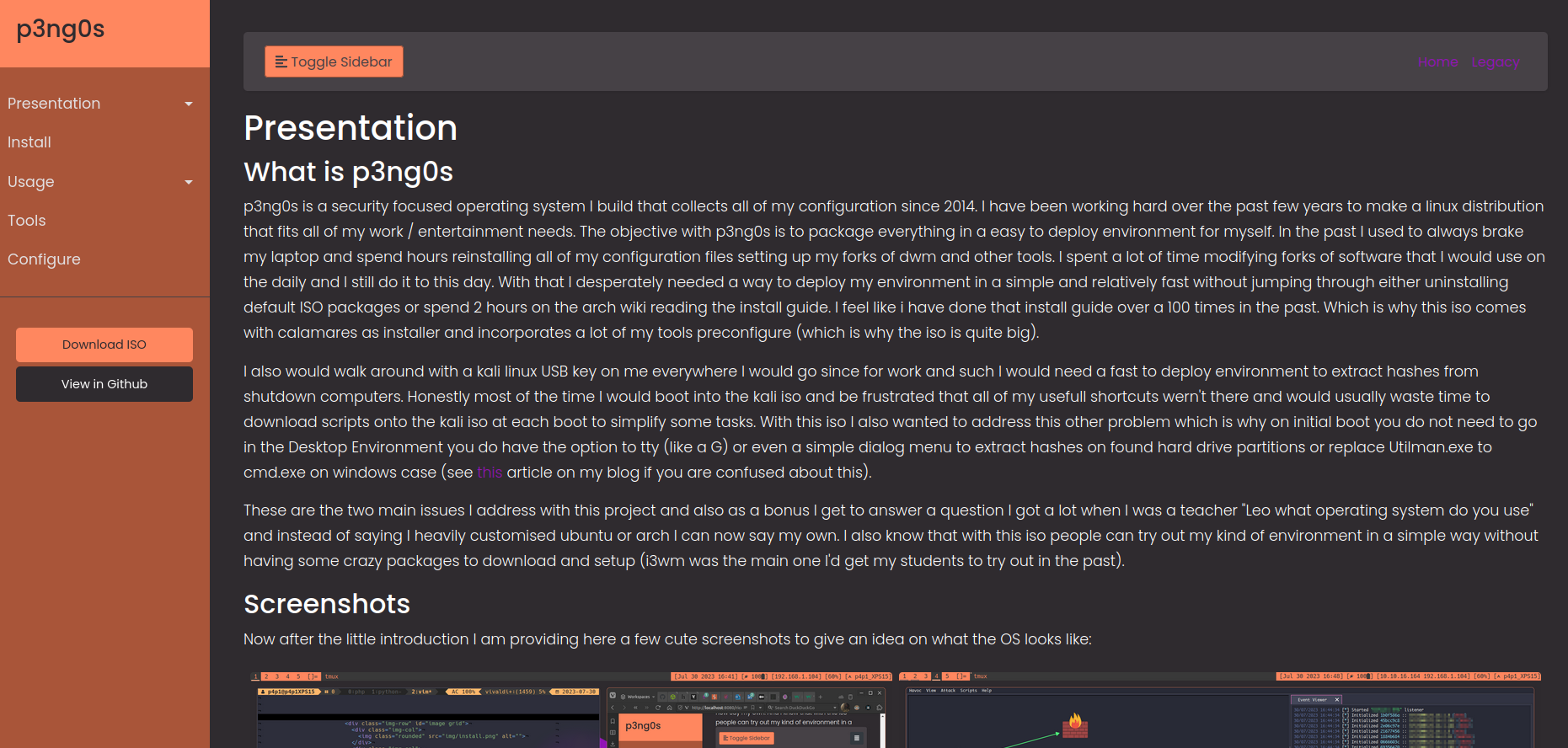 The two main features that put p3ng0s apart from other operating systems is the fact that it comes with the os_killer.sh script which will allow you to do basic exploits on machines the USB key is plugged into. It also comes with a giant post install script called git_appocalypse.sh that will just install all of the dependencies and tools to do all of the work I need to do on a day to day basis.