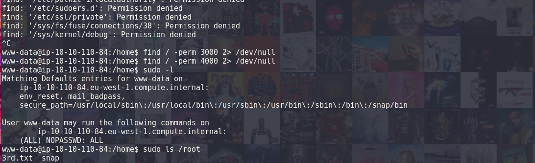 With the reverse shell working I then displayed the flag in the home folder and with the prior knowledge that the user could run sudo commands without password I displayed the flag located in the root directory