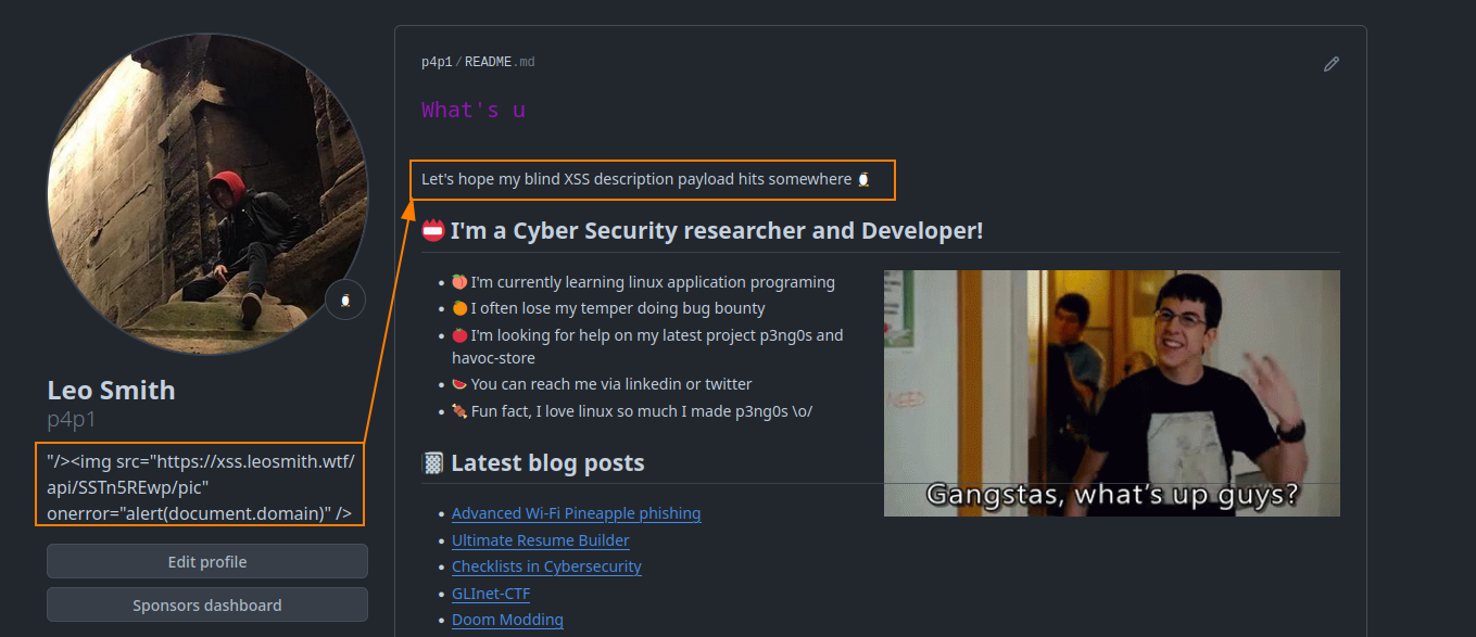 Now for those that don't know my github description it is actually quite funny. Back in 2020 learning pentesting and such I was first brought into this through web app pentesting I did some web app pentest a long time ago in 2017 when I was in highschool but it wasn't as serious as in 2020 so at that time I created a tool called xss_bomb to trigger a notification on my phone when a blind cross site scripting payload triggered (Fun fact: I actually used this tool in my eWPT exam ^^) now with this context here is my description: