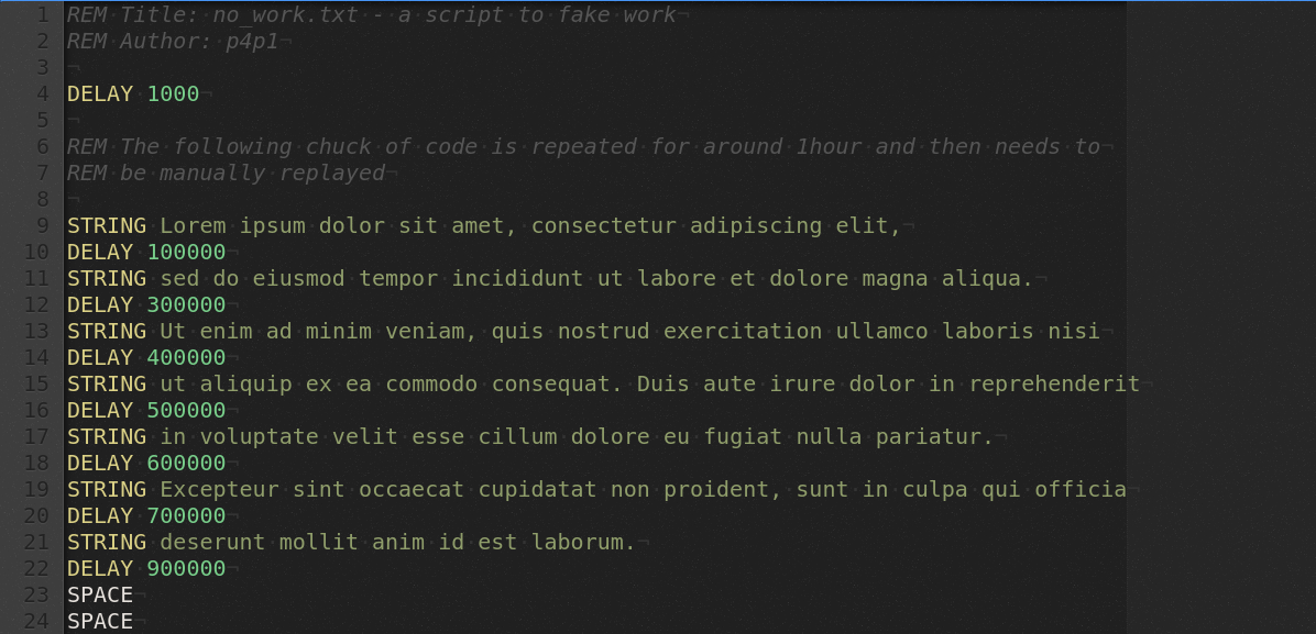 After receiving a meme from a friend of mine about your boss catching you away on MS teams while working from home and then installing a mouse randomiser on your computer to randomly move your mouse around to "fake" work. I had the brilliant of using the USB rubber ducky to spit out a bunch of Lorem Ipsum so that the computer never turns off.