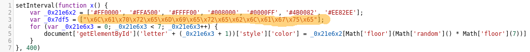 With that information I then decided to inspect the javascript found on the page. After running this code through a beautifier there is and other string that looks a lot like the title to be decrypted.
