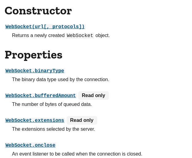 From there I now had to implement the rest of the WebSocket API not knowing how big it was I looked up online how to do that and scoped out the task. Thankfully mozilla did most of the work for me and mapped out the API on this cool website.