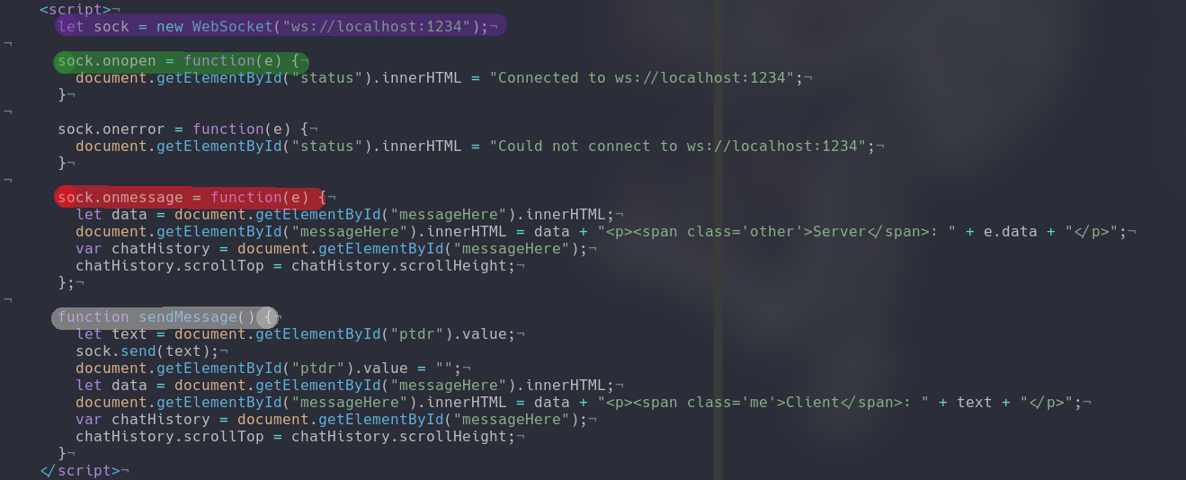 In purple I create the websocket instance used to handle the connections. In green I define the code that will be run when the connection opens. In red is the code for when the websocket clients receives a message. In white is the code for when I want to send a message to the server. Like said this client is a basic as I can get it from there I started looking at some code I found online of people reimplementing the websocket interface to see their approach.