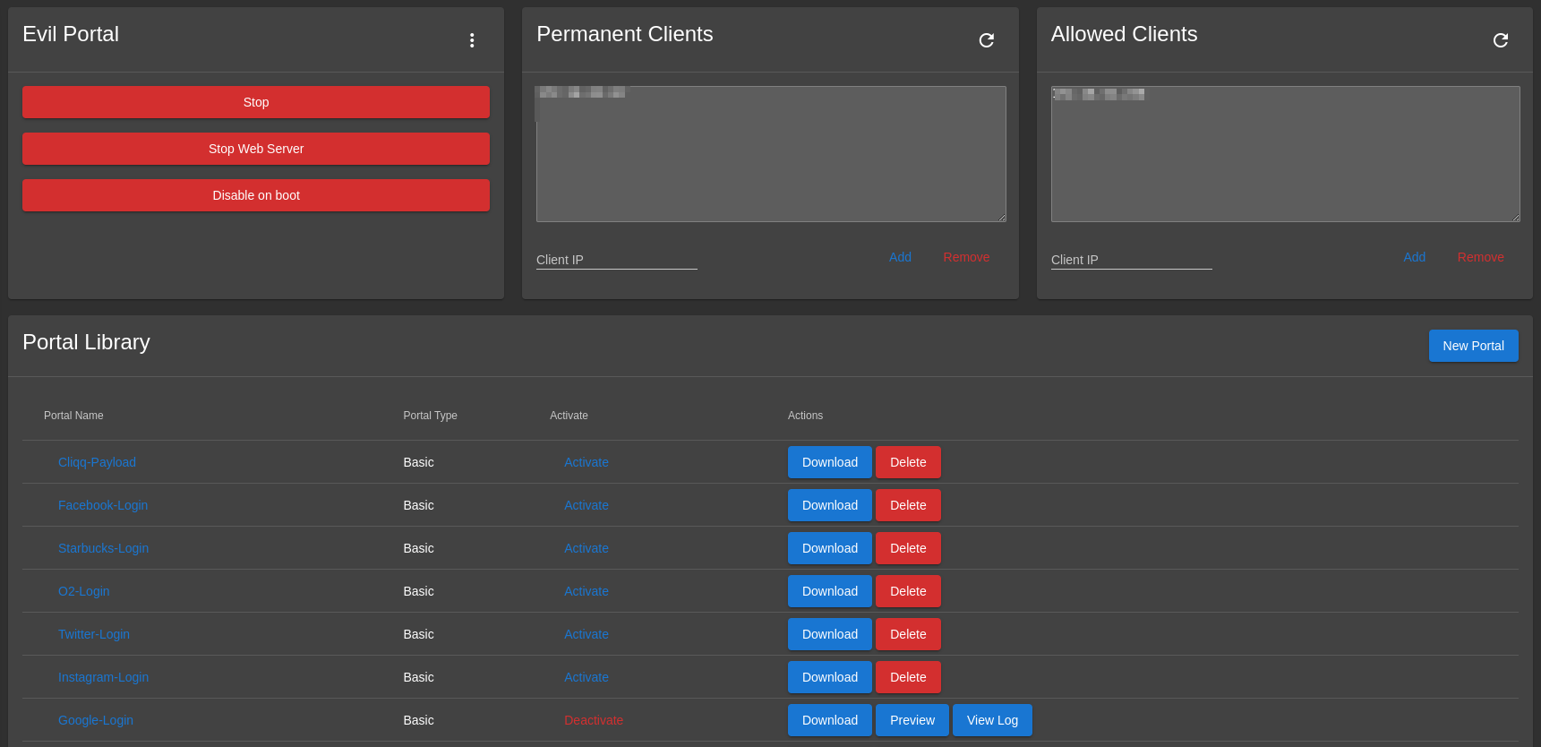 I will be using my wifi pineapple to do the attack. It does trivialise a lot of the work :) After the pineapple is booted up you will need the Evil Portal module. I will also be using kleo's evilportals repo which comes with a sweet selection of portals built in.