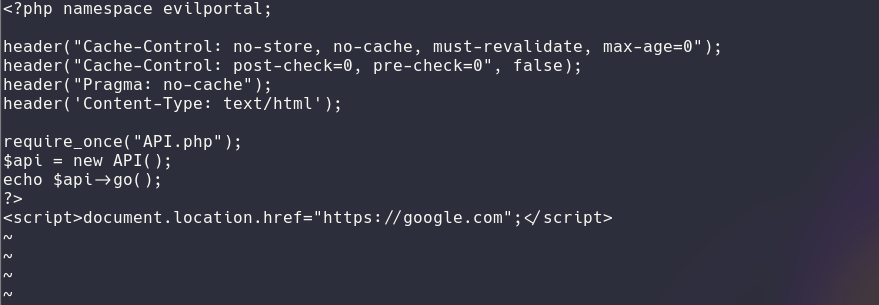 After installing the module and selecting the portal wanted I also recommend quickly editing the redirection page. By default the redirection page is setup to show a message like: You are not authorized. I think this ruins the stealthy aspect of the attack so to do that navigate to /www/captiveportal/ and edit the index.php file. I chose to redirect to google.com but it can even be a custom message.
