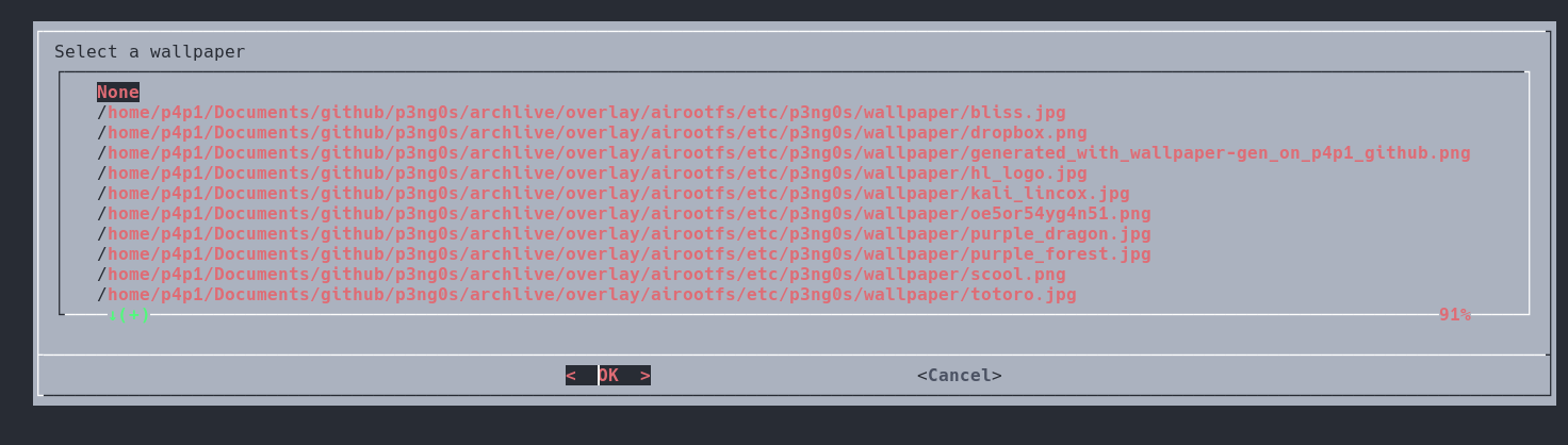 You can if you want add your wallpapers to ./overlay/airootfs/etc/p3ng0s/wallpaper/