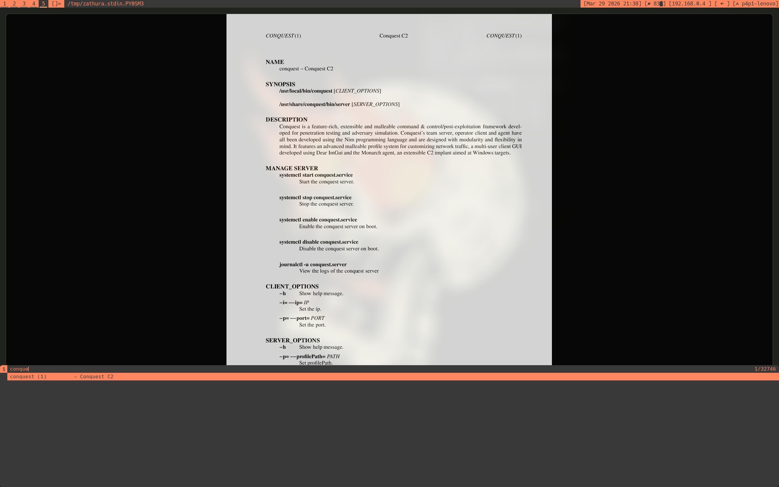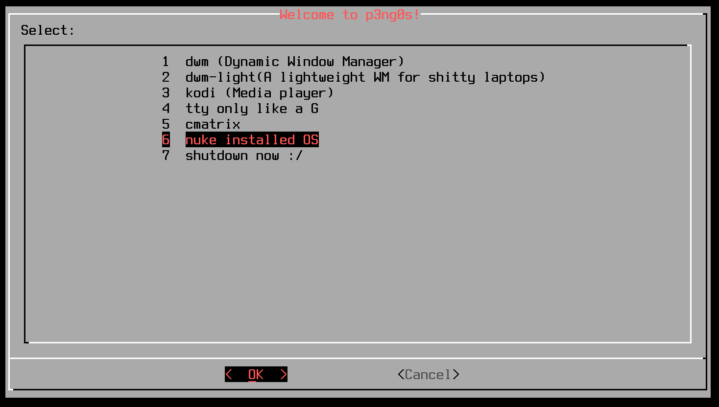 p3ng0s.iso is a security focused live operating system I build and maintain that collects all of my configuration since 2014 and common attack chains I do during engagements. This live operating system is geared towards red teaming and physical access. Most of the custom boot modes of the .iso rely on having access to the target system physically. It is not a beginner friendly linux distribution and I don't recommend building/installing it and using it as a daily driver. I personally do but every design decision in the daily driver/GUI department of the OS is built for me. Which is why there is no common "Create a user", "Choose timezone", "Choose keyboard" options. Currently p3ng0s.iso is US keyboard layout only and the timezone is not even set since those things aren't my priority yet. I might in the future add them but don't expect it to come with it as of now (April 2026).