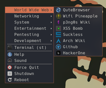 On the wallpaper of the .iso there is a live display of system usage through conky. This is great to see how long the system has been running the currently available RAM and CPU usage info. Inside of the conky config there also is a few neat features to keep it pentest focused.